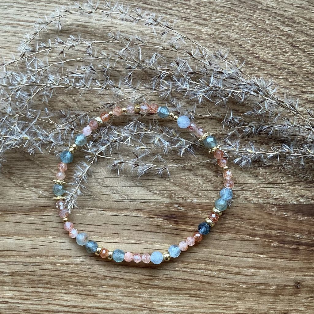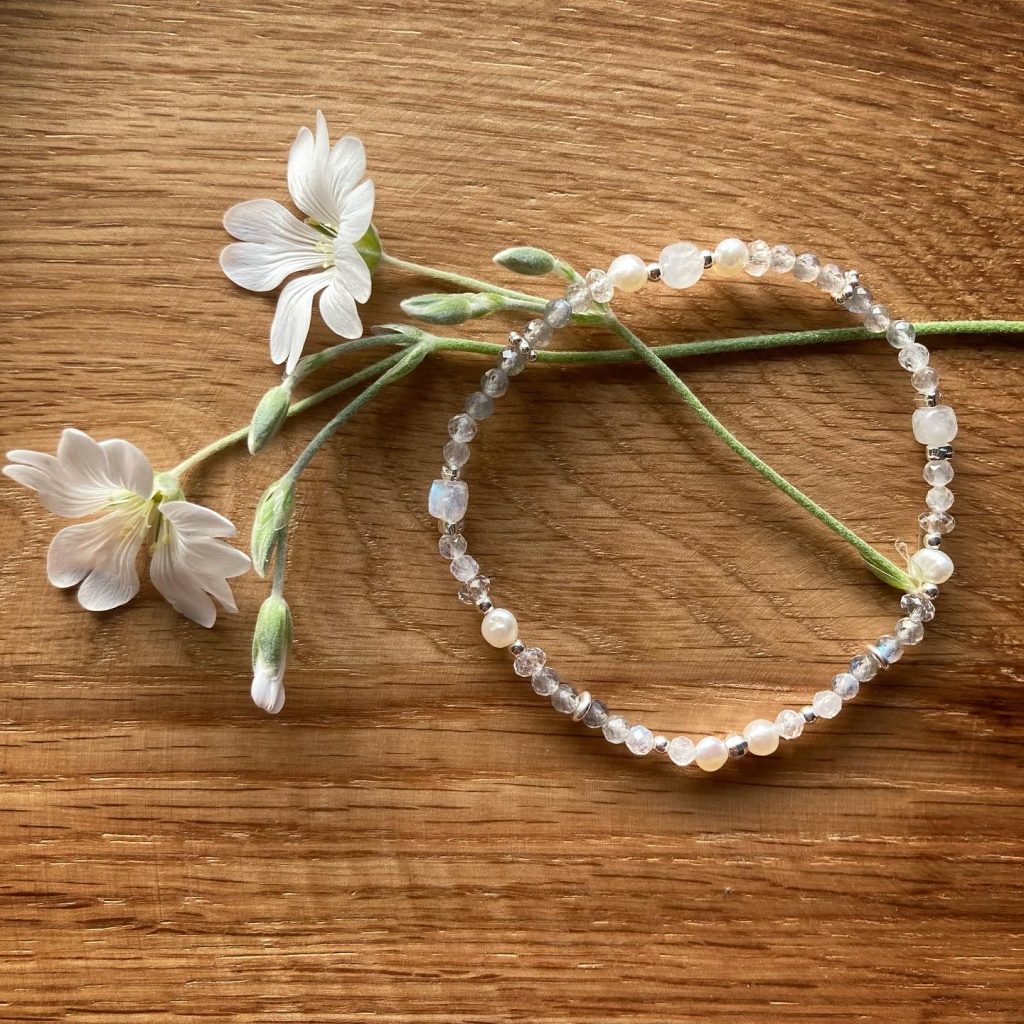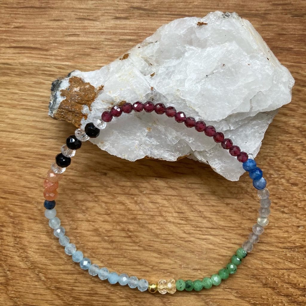 Nach deiner Vorgabe verwende ich Draht, Faden oder Schmuckelastik. Abgerundet wird dein Schmuckstück mit ausgesuchten Gold- oder Silberelementen, um dein Funkelarmband und seinen Schimmer so richtig zur Geltung zu bringen.